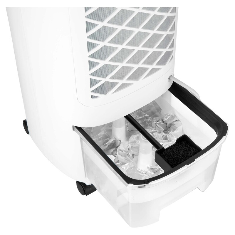 The water tank of the air cooler has a capacity of up to 3 litres of water. It is removable, easy to fill and clean. Cooling effectiveness can be further improved by using the included cooling packs (which you pre-cool in your freezer).